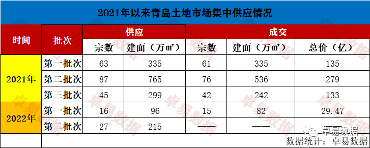 3月18日,2022年青島首批集中供地拉開帷幕,最終轉讓16塊涉宅地塊,建筑面積76.7萬平方米,總成交額29.5億元。