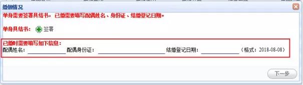 在省內(nèi)結(jié)婚的,填寫配偶姓名、身份證、結(jié)婚登記日期,點(diǎn)擊下一步