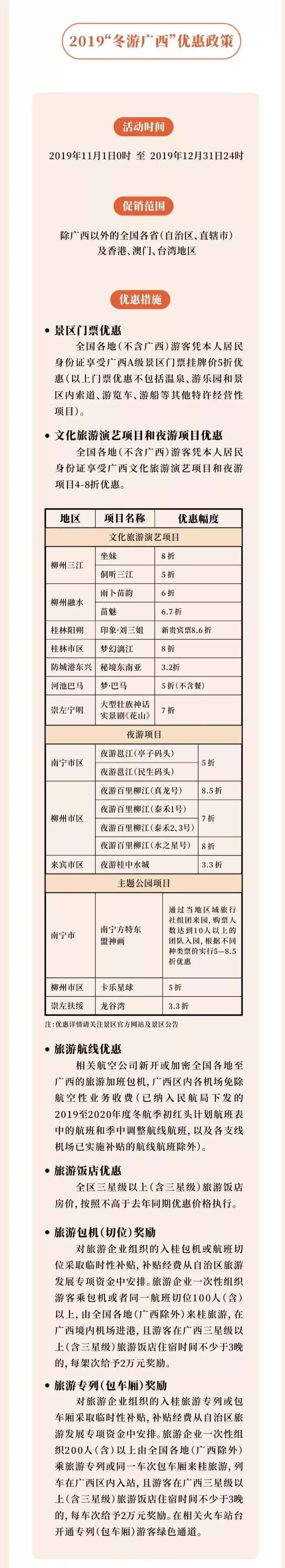 近日,廣西壯族自治區(qū)文化旅游網(wǎng)站發(fā)布了2019年廣西冬季旅游優(yōu)惠政策:除廣西省(自治區(qū)、直轄市)、香港、澳門、臺灣游客憑居民身份證享受廣西A景區(qū)門票折扣(以上門票折扣不包括溫泉、游樂園、索道、游覽車、游輪等特許經(jīng)營項目)。活動截止到12月31日24點。