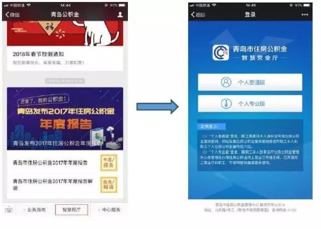 1.關(guān)注青島公積金微信官方賬號(hào),點(diǎn)擊智能網(wǎng)大廳,選擇個(gè)人普通版或個(gè)人專業(yè)版登錄。(網(wǎng)絡(luò)大廳的個(gè)人專業(yè)版本需要持身份證到市住房公積金營(yíng)業(yè)廳辦理開(kāi)放手續(xù),網(wǎng)絡(luò)大廳的個(gè)人普通版本可以通過(guò)官方網(wǎng)站直接注冊(cè)。